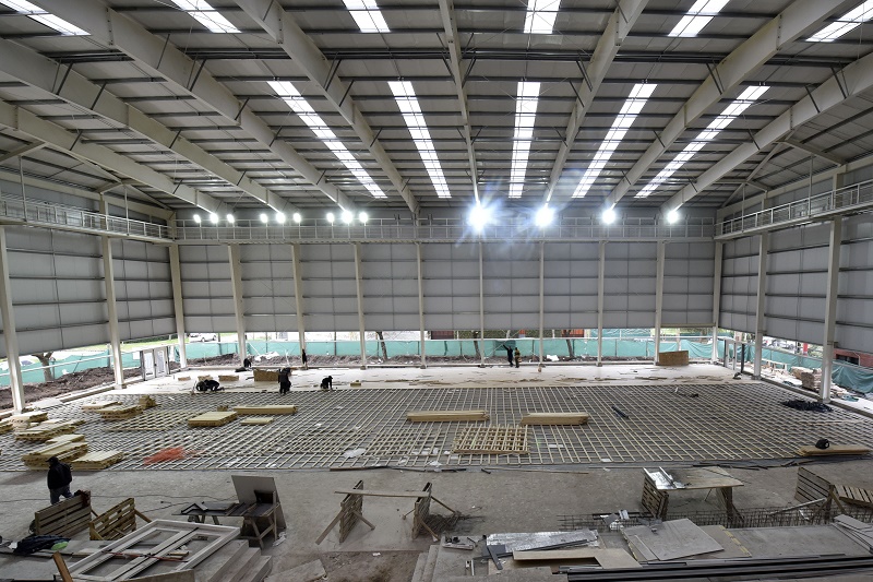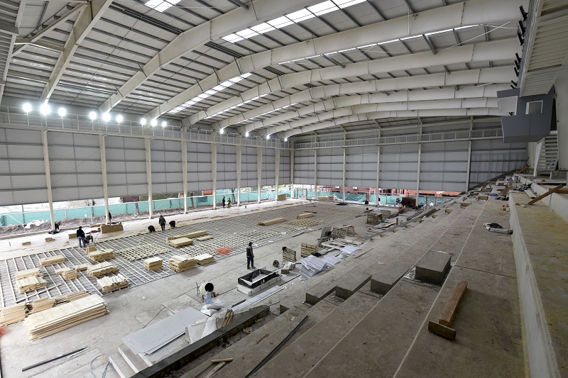 Las labores continúan con la colocación de revestimientos y carpintería metálica en el perímetro. También, se avanza en el montaje de la cabina y la instalación del piso deportivo.