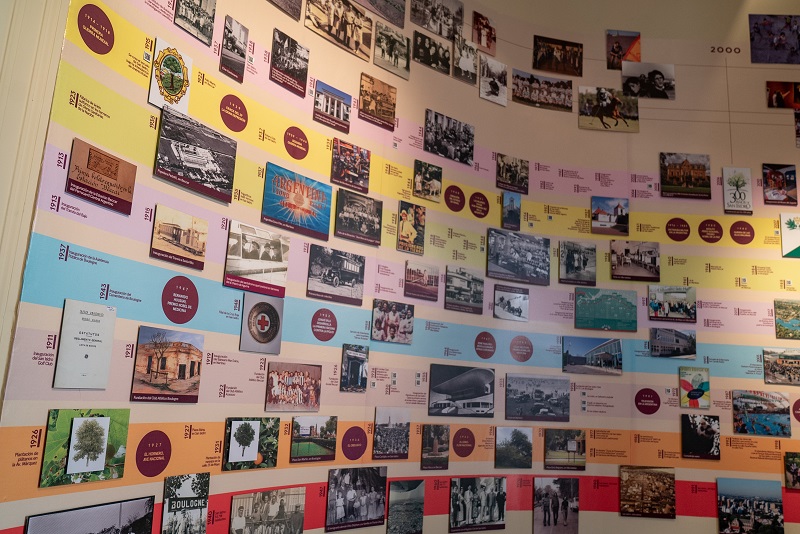 La primera sala es una extensa línea de tiempo que inicia en el 10.000 A.C., llega al presente y se divide en cultura y educación, hechos, instituciones y comunidad, Industria y comercio, transporte y comunicación, salud e higiene, deporte y tiempo libre, paisaje natural y urbano, y poblamiento y territorio, cada cual con su color.