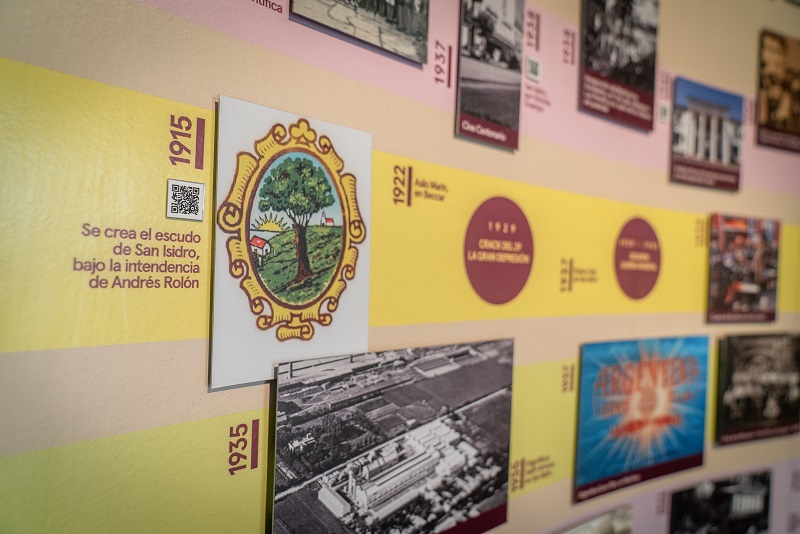 Por último, la línea de tiempo cobra vida en las cajas/vitrinas de la tercera sala, que exhiben objetos donados por vecinos y testimonios en primera persona asociados a estas piezas en cartillas plastificadas listas para ser tomadas y leídas. Una sala colorida que respeta los tonos de los distintos núcleos temáticos e incluye un autorretrato de Guillermo Roux, una pieza de la ex fábrica Lozadur, camisetas de rugby, una gorra de la nadadora Delfina Pignatiello, zapatillas de baile de Cecilia Díaz, la primera máquina del reloj floral de la Plaza Mitre, el primer teléfono de San Isidro, boletos antiguos de colectivos y trenes, libretas escolares, un Índice Patentes de Rodados del municipio, herramientas que fueron de una las primeras parteras del pueblo, una maleta de inmigrantes y demás.