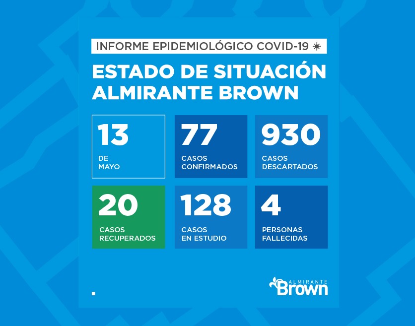 La Secretaría de Salud del Municipio de Almirante Brown informó que al miércoles 13 de mayo de 2020 se registraban 77 casos positivos de Coronavirus notificados por las autoridades sanitarias nacionales. Mientras tanto, 930 test realizados en el distrito dieron negativos y 128 casos se encuentran en estudio.